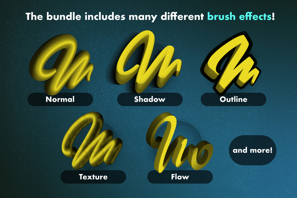 The bundle includes a variety of different brush effects, such as Shadow, Outline, Texture, Flow, and more! Over half of the brushes allow you to blend lines, enabling you to create any shape, letter, or word with a single stroke on one layer.