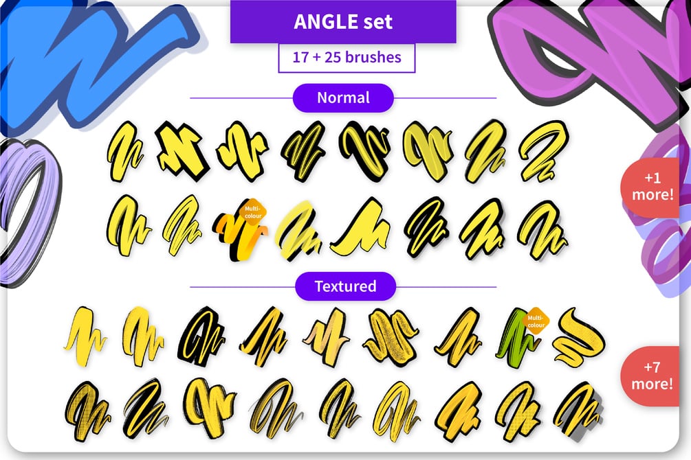 Brushes offer amazing possibilities of combining two colors and blending/merging lines. The brush set is perfect for any kind of lettering, calligraphy and graffiti (but not only).