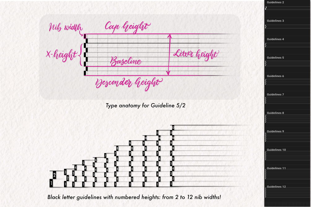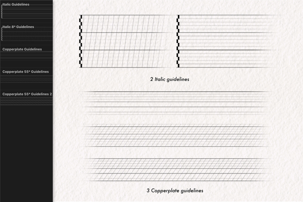 The whole bundle is designed to allow you to practice any calligraphy style you desire (Black letter, Italic, Uncial, Copperplate, Brush lettering, modern calligraphy, and much more!). Start practicing and lettering on Procreate: choose a style, select the appropriate, and guideline, and begin your practice!