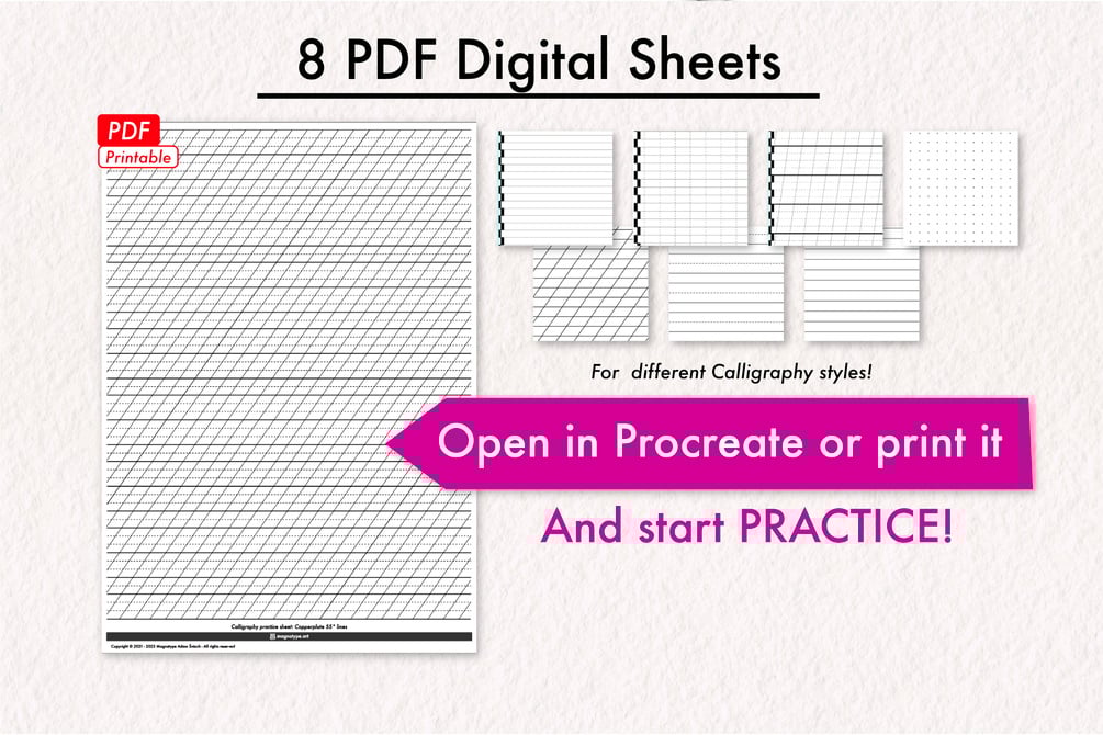Additionally, the set includes 8 PRACTICE SHEETS for various calligraphy styles that you can easily import into Procreate. If you prefer a physical version, no problem - the PDF sheets are printable in A4 format (210 x 297 mm). Enjoy!
