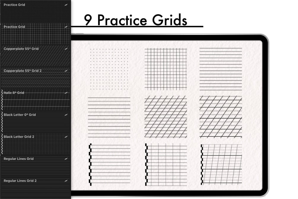 Calligraphy Practice toolkit for Procreate | Lettering Guidelines, Grids, Brushes, Sheets
